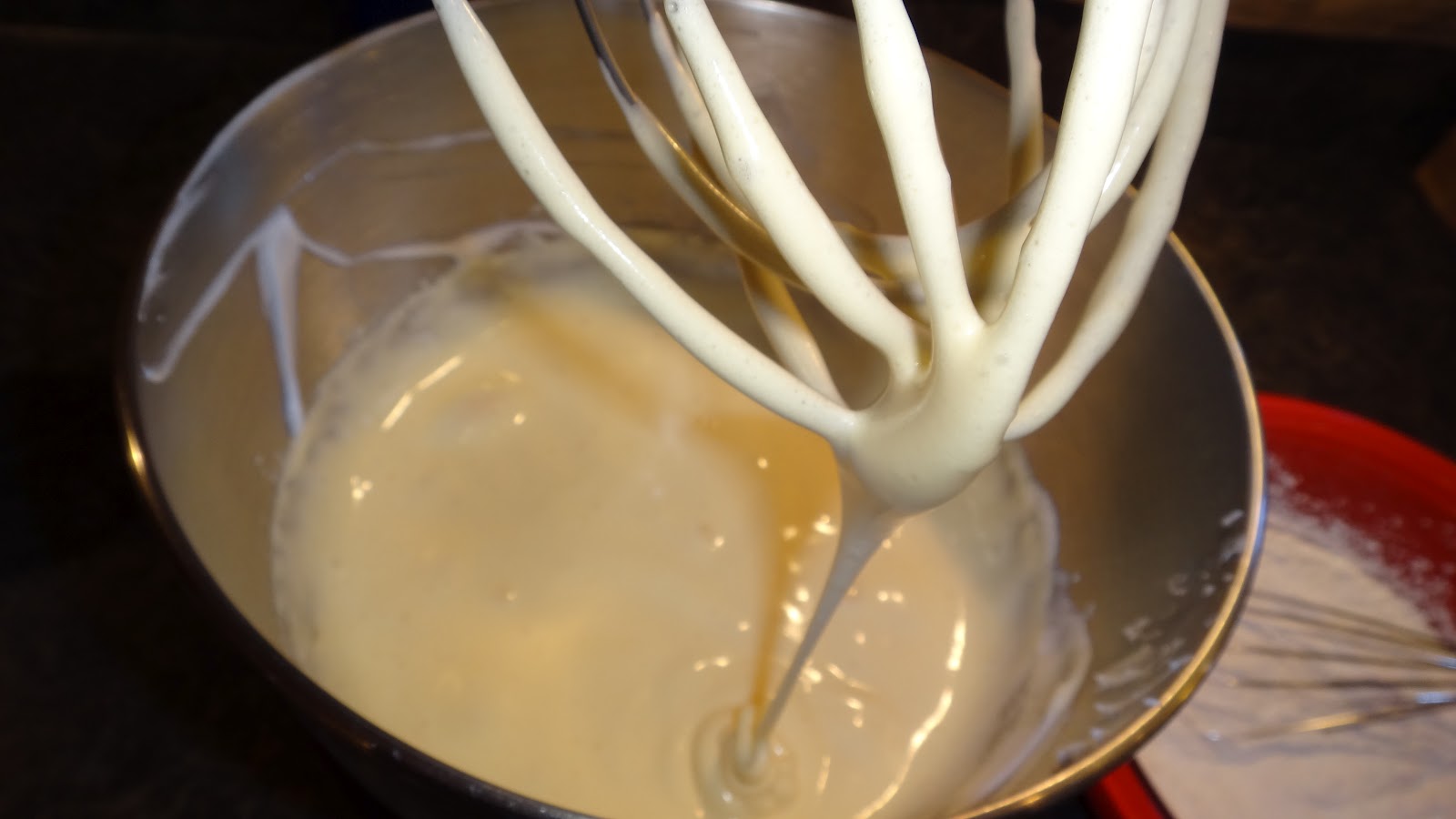 Step 3: In a stand mixer with the whisk attachment beat 4 egg whites, 1/2 tsp cream of tartar and 1/4 cup sugar. Beat until thick and forms medium peaks. Approx 4 minutes on medium/high speed. Scrape into bowl, cover and refrigerate.