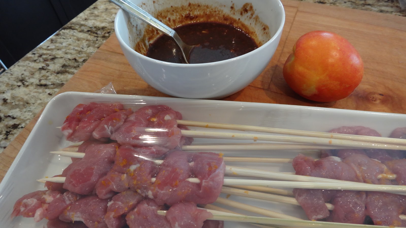 Step 3: soak bamboo skewers (or use metal) and thread the meat on in a ribbon or satay like fashion. Pour on some good olive oil and some finely zested orange. Let marinate for a few hours or you can cook right away.